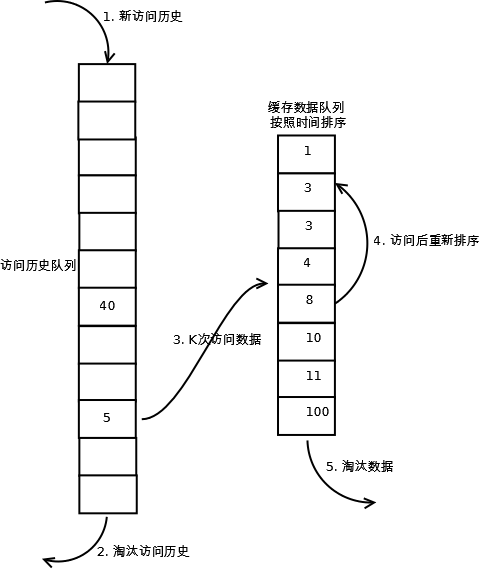 LRU-K中的K代表最近使用的次数,因此LRU可以认为是LRU-1。LRU-K的主要目的是为了解决LRU算法“缓存污染”的问题,其核心思想是将“最近使用过1次”的判断标准扩展为“最近使用过K次”。